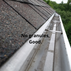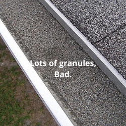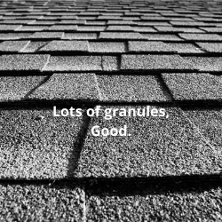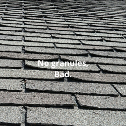 This is the primary indicator to determining the current age and the expected remaining life span of any asphalt shingle product. Granules (slate, schist, quartz, vitrified brick, stone, or ceramic) typically start to deteriorate at or around 75% of the intended lifespan and can vary depending on the quality of the product used. They can, however, begin to deteriorate much sooner, depending on the installation and if best practices were used during installation. Foot traffic on asphalt shingles will deteriorate these shingles faster than any other cause. It is therefore vital that foot traffic during the installation process is kept to a bare minimum.