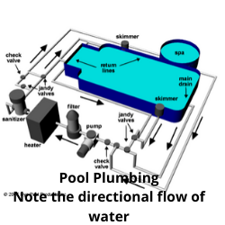 The plumbing system is tying all the pool system components together to provide the required circulation and is always under pressure. Jandy valves are used to divert or revert water to different locations or to increase and decrease pressure within the system. Check valves (clear plastic tubing or globe) are used to monitor the integrity of the system and provide visual insight in real time inside of the pressurized system. Below are the names of the most common plumbing system components.
